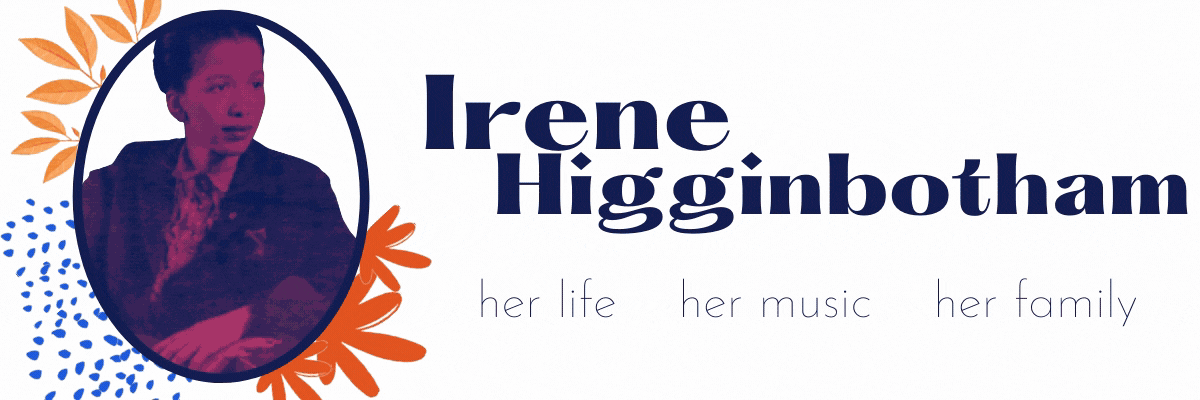 Irene Higginbotham was born June 11th, 1918 in Worcester, MA. Her mother, Hart Jones Higginbotham, died just over a year after Irene was born. Her father, Garnett Roy Higginbotham raised her in Atlanta, Georgia. He was a tailor, educator and journalist and taught Irene piano. Irene began composing in her teens and studied music with Kemper Harreld and Frederick Hall while in Atlanta. She eventually talked her father into moving to New York with her so that she could become a songwriter. Her uncle, J. C. Higginbotham, was a famous trombone player working with Louis Armstrong in Red Allen’s band. A few of Irene’s first published and copyrighted tunes were written with her uncle. J.C. brought one of Irene’s tunes into a rehearsal with the Red Allen band. The tune was called Harlem Stomp. The group liked the tune so much that they recorded it on their next session and the rest is history!